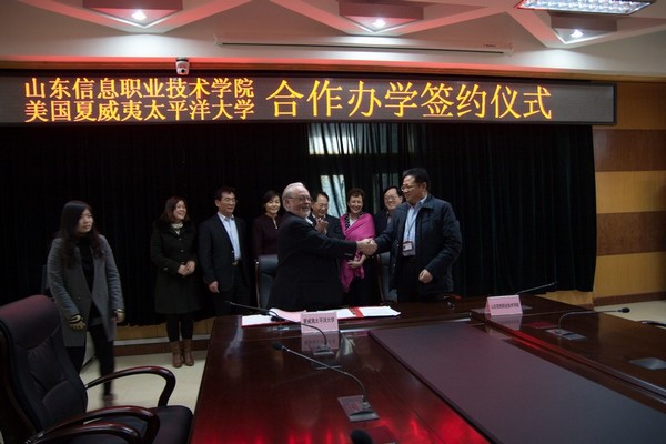 3月21日,山东信息职业技术学院与美国夏威夷太平洋大学合作办学协议在我院签署。夏威夷太平洋大学校长杰弗里·班尼斯特、学院院长肖朋旭在合作协议上签字,夏威夷太平洋大学副校长玛丽·艾伦·麦吉兰、山东信息职业技术学院有关人员参加了签字仪式。
