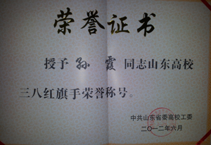 “山东高校三八红旗集体”,授予孙霞教授“山东高校三八红旗手”荣誉称号。